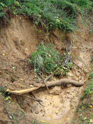 The storm was forcast, so we tried to secure the bit above our pond as well as possible, but... it wasn't good enough. When checking while the rains were still on the pond was filling up nicely and everything was hunky dory, but today we discovered that the boards above the pond had give way and has turned the pond into one big mud hole.
